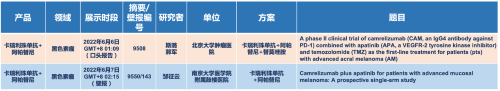 在黑色素瘤领域,EVO视讯医药的卡瑞利珠单抗联合阿帕替尼(“双艾”组合)在2022 ASCO共入选1项口头报告和1项壁报展示。