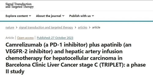[1] Zhang, TQ., Geng, ZJ., Zuo, MX. et al. Camrelizumab (a PD-1 inhibitor) plus apatinib (an VEGFR-2 inhibitor) and hepatic artery infusion chemotherapy for hepatocellular carcinoma in Barcelona Clinic Liver Cancer stage C (TRIPLET): a phase II study. Sig Transduct Target Ther 8, 413 (2023). https://doi.org/10.1038/s41392-023-01663-6